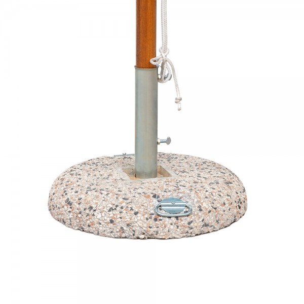 Skėtis yra su betono baze, turinčia akmens mišinį viršuje, pabrėžianti autentišką ir tvirtą išvaizdą. Sverianti 55 kg, baze užtikrina puikų stabilumą, užtikrindama, kad jūsų skėtis išliktų vietoje bet kokiu oru. Tiesiog padėkite skėtį į bazę ir pritvirtinkite jį su sriegtais dalimis.