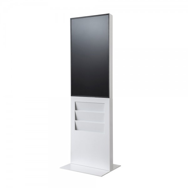 Smart Line Digital Totem Rack be rėmo dizainas suteikia modernų ir elegantišką prisilietimą. Integruotas brošiūrų laikiklis su trimis erdviais kišenėmis puikiai tinka pristatyti 6 x A4 spausdintus reklaminius medžiagas. Skaitmeninis ekranas, kuris idealiai tinka naudoti parduotuvės įėjimuose, parodų salėse, parodų centruose ar svečių aptarnavimo sektoriuje.