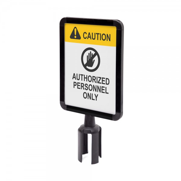 Juodas barjerinis lankstus diržo stovas su ekonominiu A4 formato ženklų laikikliu
