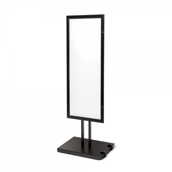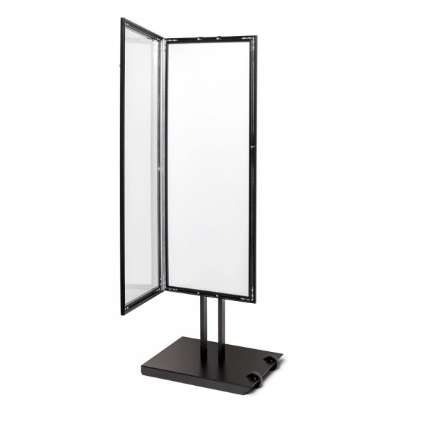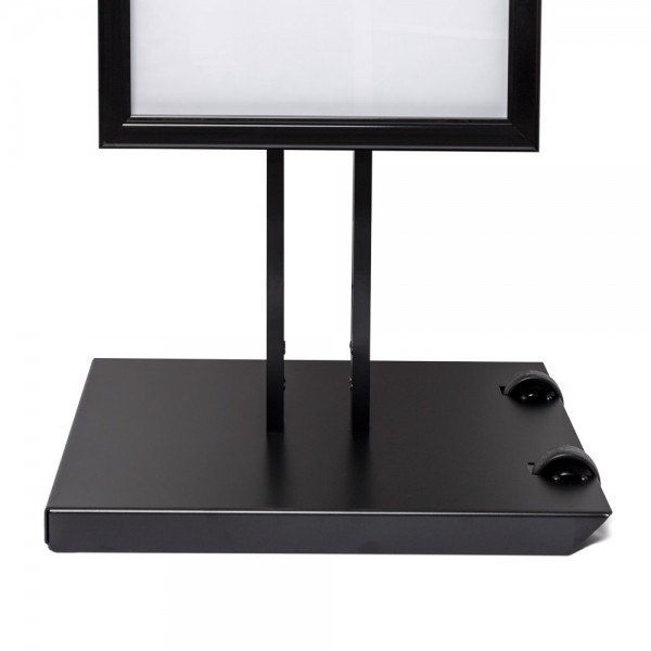 Šis stovas yra aprūpintas masyviu plieniniu pagrindu, suteikiančiu papildomą stabilumą. Užrakto dėžutė saugo jūsų reklamą saugiai, o įtrauktas raktas palengvina užrakinimą.