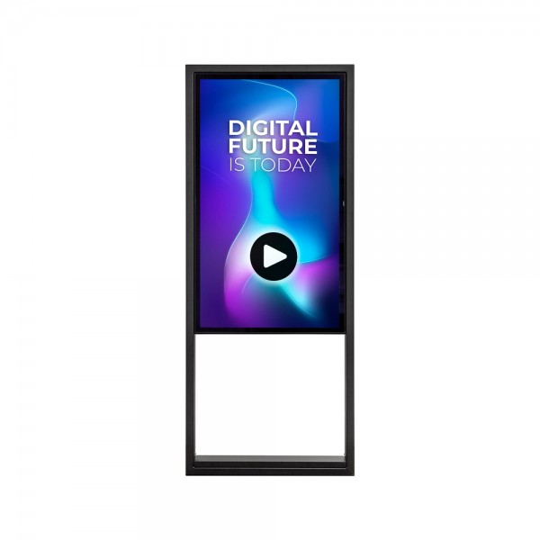 Prisidengkite dėmesį, rodydami savo reklaminį pranešimą lauke su šiuo atspariu oro sąlygoms skaitmeniniu lauko totemu. Pakvieskite lankytojus į vidų pas jus. Turi atsparų smūgiams stiklą ir tvirtą aliuminio korpusą, taip pat galima montuoti ant grindų. Idealu naudoti prekybos centruose, oro uostuose ir parodose.