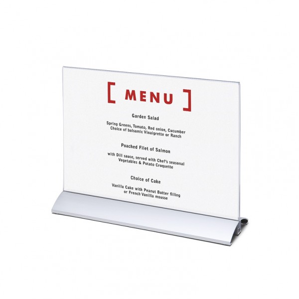 Pristatykite savo meniu, kainas ar informaciją naudodami Meniu kortelių laikiklį. Stalo ženklas su aukštos kokybės išvaizda, idealiai tinka rodyti ant stalo ar ant prekių lentynų. Greitai ir lengvai keiskite savo turinį, tiesiog įdėdami lapą į skaidrų akrilinį laikiklį. Galima naudoti horizontaliai ar vertikaliai. Puikiai tinka naudoti laukimo patalpose ar registratūrose viešuosiuose erdvėse, prekyboje ar viešbučių sektoriuje.