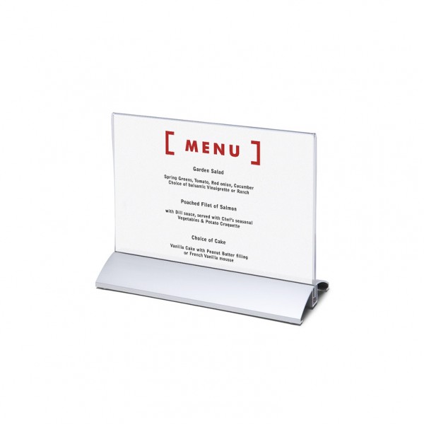 Pristatykite savo meniu, kainas ar informaciją naudodami Meniu kortelių laikiklį. Stalo ženklas su prabangiu dizainu, idealus rodyti ant stalo ar ant skaitiklių. Greitai ir lengvai pakeiskite savo turinį, tiesiog įdėdami lapą į skaidrų akrilinį laikiklį. Galima naudoti horizontalioje ir vertikalioje padėtyje. Idealus naudoti laukimo patalpose ar registratūrose viešuosiuose erdvėse, prekyboje ar svečių aptarnavimo sektoriuje.