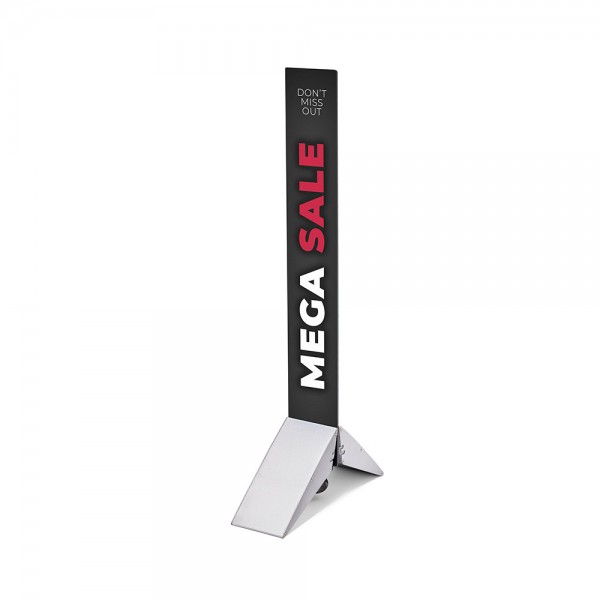 Pristatykite savo reklamą ant laisvai stovinčio panelių sprendimo. Panelių pagrindas iš aliuminio yra tinkamas laikyti spausdintus reklaminius skydus. Tinka tiek vidaus, tiek lauko taikymui ir skydams, kurių storis nuo 3 iki 26 mm. Ideali parduotuvės ženklų lentelė, skirta parodyti jūsų pasiūlymus ir akcijas.