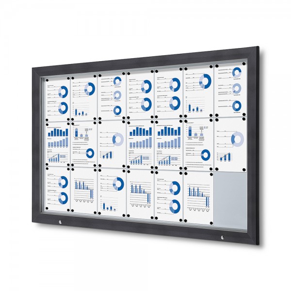 Puiki vitrina, skirta jūsų plakatų reklamos pristatymui lauke. Lauko užrakinama vitrina yra lauko vitrina, turinti didelį atsparumą ir 25 mm vidaus gylį. Tinka naudoti lauke, su IP56 orų atsparumo sertifikatu ir ugnies apsaugos sertifikatu B1 DIN4102. Rašoma ir magnetinė. Tinka sienų, tvorų ir laisvai stovinčių stulpų montavimui. Prieinama įvairių dydžių. Dydžiai, kurie telpa daugiau nei 12 A4 lapų, yra aprūpinti dujų spyruoklėmis. Puiki užrakinama vitrina plakatams, reklamoms ar pastaboms lauke.