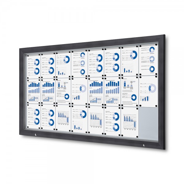 Puiki vitrina, skirta jūsų plakatų reklamai pristatyti lauke. Lauko užrakinama vitrina yra lauko vitrina, turinti ypatingą atsparumą ir 25 mm vidinį gylį. Tinka naudoti lauke, su IP56 orų atsparumo sertifikatu ir ugnies apsaugos sertifikatu B1 DIN4102. Rašoma ir magnetinė. Tinka montuoti ant sienos, tvoros ar laisvai stovinčio stulpo. Prieinama įvairių dydžių. Dydžiai, kuriuose galima įdėti daugiau nei 12 A4 lapų, yra aprūpinti dujiniais amortizatoriais. Puiki užrakinama vitrina plakatams, reklamoms ar pastaboms lauke.