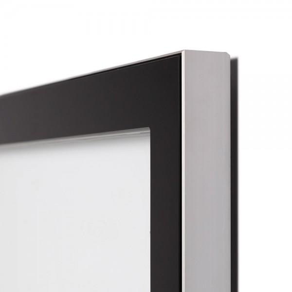 Lauko Premium Plakatų Dėklas Slim siūlo stilingą, ploną dizainą su juoda keraminė spauda ant priekinio stiklo ir sidabro spalvos šonais. Jo paslėpti kampai suteikia išraiškingą ir modernų estetiką, todėl jis puikiai tinka plakatų demonstravimui.