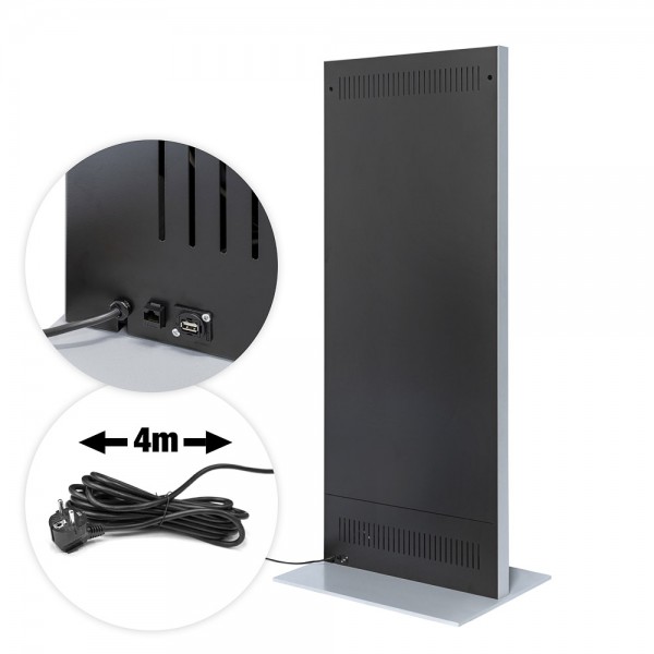 Šis skaitmeninis reklaminis stulpas su plonu dizainu pritraukia dėmesį į jūsų reklaminį pranešimą. Priekis pagamintas iš atsparaus stiklo, kad būtų apsaugotas ekranas. Puikiai tinka naudoti vietose, kuriose turite ribotą erdvę, pvz., parodoje ar parduotuvės įėjime.