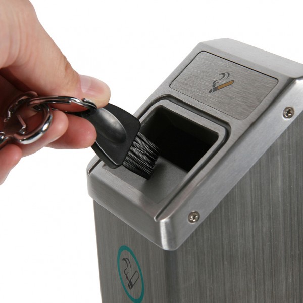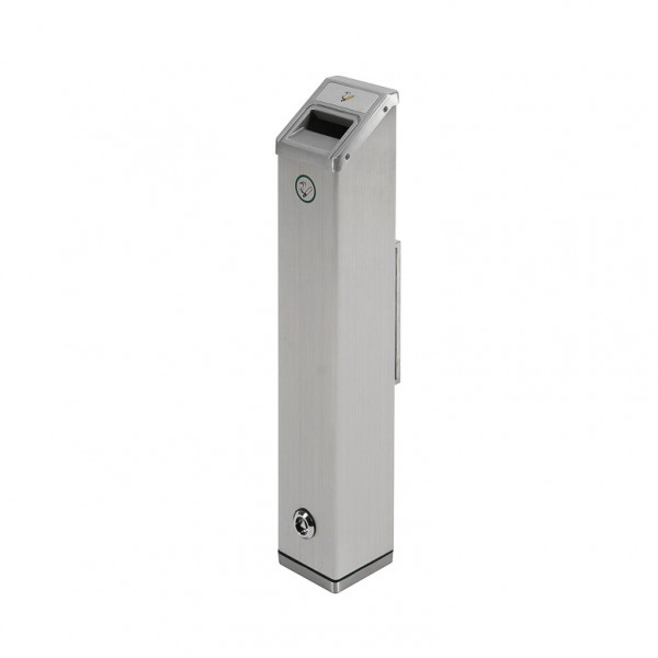 Nebekibirkštų ant žemės su stačiakampiu pelenų indu, kuris tvirtinamas prie sienos. Tai praktiškas ir prieinamas sprendimas lauko rūkantiems. Stačiakampė plieninė konstrukcija su šlifuotu aliuminio apdaila. Visiškai aprūpintas sienos tvirtinimo komplektu, raktų grandine ir veržliu. Idealu naudoti už ofisų ir darbo vietų, viešbučių sektoriuje ar lauko viešose vietose.