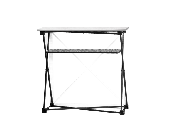 Sukurkite profesionalų įvaizdį naudodami „Counter Fabric“ stalo viršų. Sulankstomas aliuminio rėmas lengvai pasidės po naudojimo. Grafika gali būti lengvai ir saugiai pritvirtinama su tvirtu Velcro dirželiu ir taip pat lengvai keičiama. Standartiškai įrengtas su lentyna ir mediniu viršumi. Puikiai tinka produktų pristatymui ar informacijos stendui.