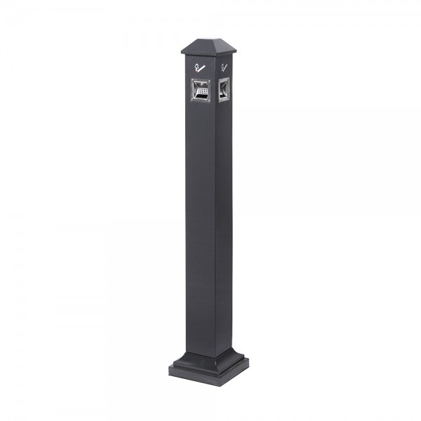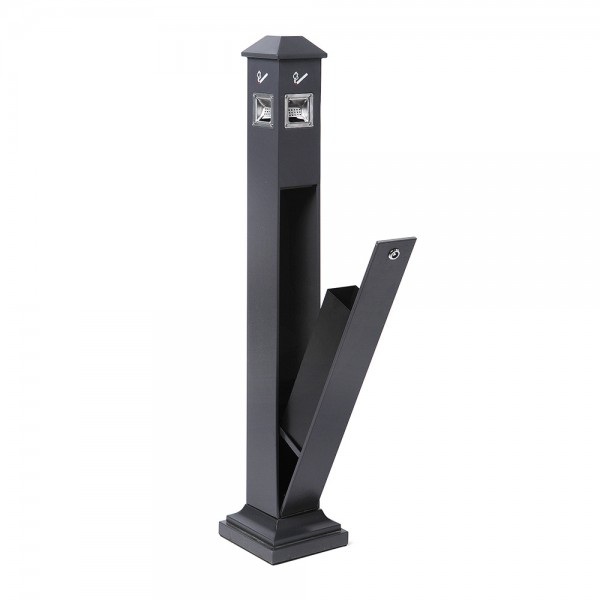 Neleiskite jokių cigarečių ir šiukšlių ant žemės su stovinčiu pelenų dėklu. Elegantinis juodas stovintis plieninis konstrukcijos pelenų dėklas, kuris turi prieigą iš keturių pusių. Tinka naudoti lauke ir lengvai atidaryti bei valyti. Stovintis pelenų dėklas tiekiamas su saugumo užraktu, kad būtų išvengta bet kokio piktnaudžiavimo. Puikiai tinka naudoti viešbučių sektoriuje, prie prekybos centrų arba įėjime į viešąsias erdves.