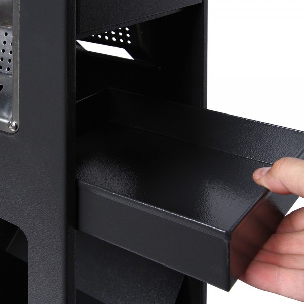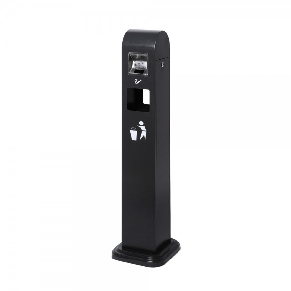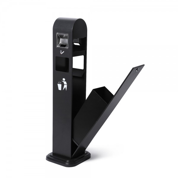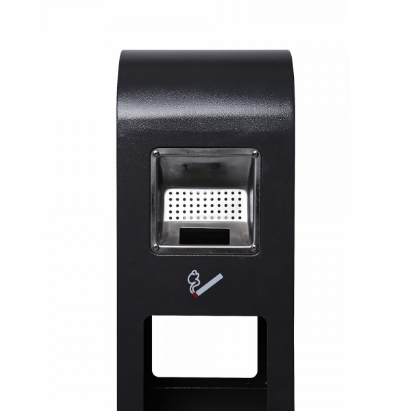 Nebekraipysite šiukšlių ar pelenų ant žemės su stovinčiu pelenų dėklu su šiukšliadėže; pelenų dėklas ir šiukšliadėžė viename. Stovintis pelenų dėklas iš plieno konstrukcijos elegantišku juodu atspalviu. Tinka naudoti lauke, galima pritvirtinti gręžiant skyles ir tvirtinant prie žemės. Labai lengva atidaryti ir valyti. Puikiai tinka naudoti viešbučių sektoriuje, prekybos centruose arba viešųjų erdvių įėjimuose.