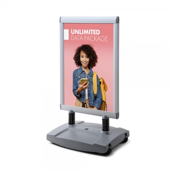 Pritraukite dėmesį praeinančių klientų į savo prekės ženklą, produktus ar pasiūlymus su aukštos kokybės šaligatvio ženklu Windtalker® Excel su plastikine baze. Tai puikus šaligatvio ženklas lauko naudojimui, kurį lengvai galite perkelti su integruotomis ratukais. Plastikinė bazė gali būti užpildyta vandeniu ar smėliu. Greitai ir lengvai pakeiskite savo plakatų reklamą kitai reklamai ar akcijoms. Puikiai tinka rodyti pasiūlymus ir akcijas prie įėjimo į prekybos centrus ar pabrėžti naujus produktus prie parduotuvių įėjimo.