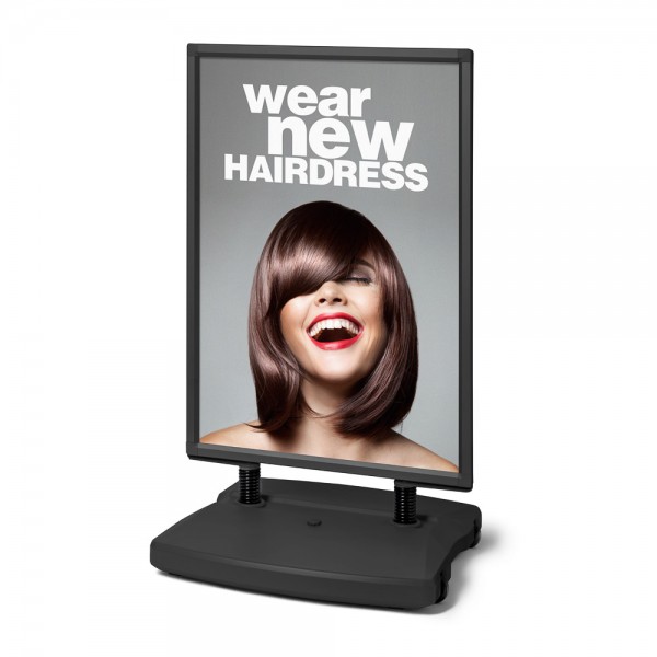 Pritraukite dėmesį praeinančių klientų į savo prekės ženklą, produktus ar pasiūlymus su šaligatvio reklaminės lentos Windtalker® City plastikiniu pagrindu. Tai puiki šaligatvio reklaminė lenta lauko naudojimui, kurią lengvai galite perkelti su integruotomis ratukais. Plastikinis pagrindas gali būti užpildytas vandeniu ar smėliu. Greitai ir lengvai pakeiskite savo plakatų reklamą kitai reklamai ar akcijoms. Galima įsigyti sidabro ar juodos spalvos. Puikus būdas rodyti pasiūlymus ir akcijas prie įėjimo į prekybos centrus ar pabrėžti naujus produktus prie parduotuvės įėjimo.
